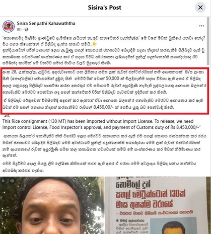 සුනිල් හඳුන්නෙත්ති මහතා දුන් කෝල් එකක් ගැන ආන්දෝලනයක් තියෙනවානෙ. රුවන් අසුරමුනි කියල මානව හිමිකම් සංවිධානයක සභාපති කෙනෙකු ඉන්දියාවෙන් ආනයනය කරපු කන්ටේනර් පහක කිලෝ 130,000ක හාල් වගයක් කිලෝවකට රු. 65 බැගින් වූ තීරු බදු නොගෙවා නිදහස් කරගැනීමට හඳුන්නෙත්ති ඇමතිතුමා මැදිහත් වූ බව තමයි කියන්නෙ. Continue Reading
