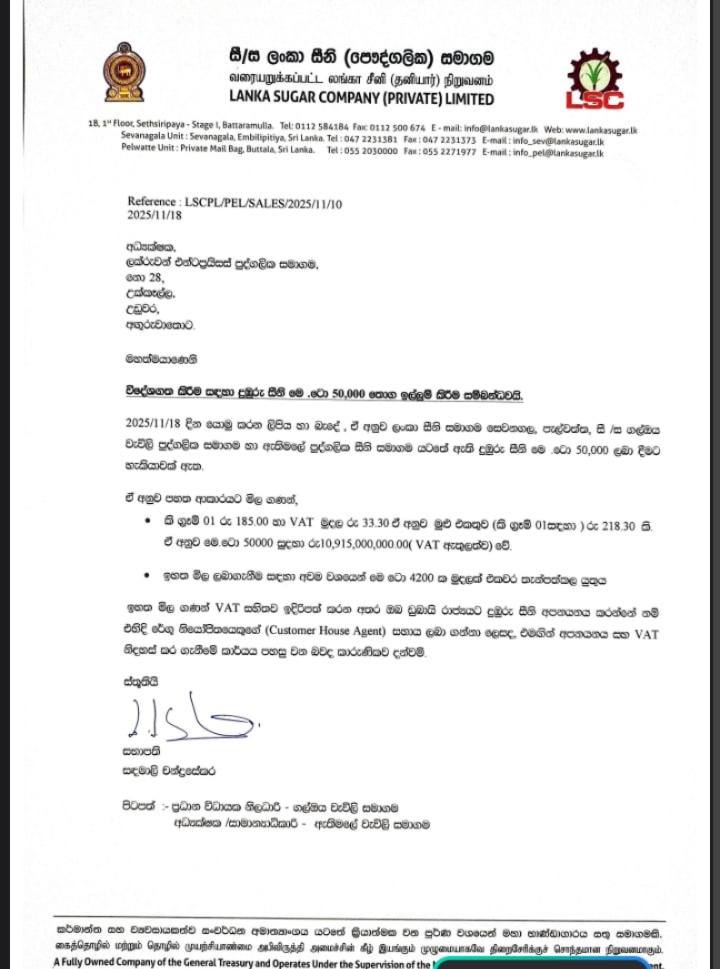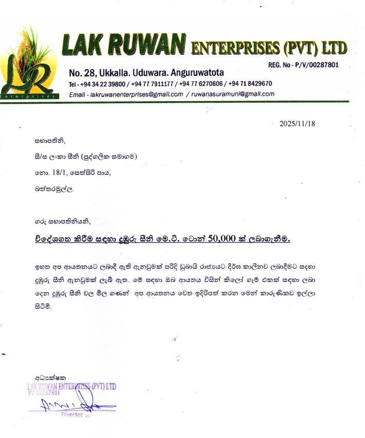 දුඹුරු සීනි ටිකක් නෙමෙයි, මෙට්‍රික් ටොන් 50,000ක්, කොහෙටද, ඩුබායිවලට, කෙටි කලකට නෙමෙයි දිගටම, අපනයනය කරන්න යන කොම්පැනිය තියෙන්නෙ අඟුරුවාතොට පාලම ගාවින් ගල්පාත පැත්තට යන, හරියට බස්සෙකක්වත් යන්නෙ නැති උඩුවර පාරෙ හද්ද ඩොටේ ගමක කියහන්කො. ඊමේල් එක ජීමේල්. ලංකා සීනි සමාගම ඉතින් ටක් ගාලා උත්තරත් බැඳලා.