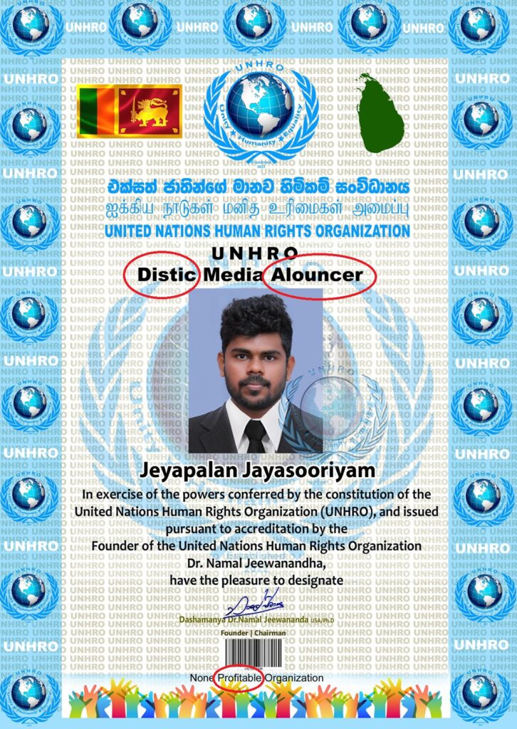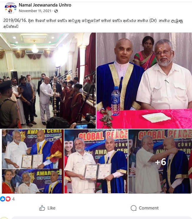 United Nations Human Rights Organization නමින් ෆේස්බුක් පිටුවක් තිබෙනවා. විවිධ සම්මාන, තනතුරු ආදිය දෙන සංවිධානයක්. එසේ දෙන්නේ මුදලට බව තමයි දැනගන්නට තිබෙන්නේ. එහි නිර්මාතෘවරයා බව කියන නාමල් ජීවානන්දගේ ඡායාරූපයක් හා ඔහුට ආචාර්ය උපාධිය ලැබුණු ආකාරය පිළිබඳ ඔහුගේම ෆේස්බුක් පේජ් එකෙන් ගත් ඡායාරූපයක් ද මෙහි තිබෙනවා. එතුමා දේශපාලන පක්ෂයකත් නායකයෙකු බව කියනවා. එය ලියාපදිංචි පක්ෂ ලැයිස්තුවේ නම් නැහැ.