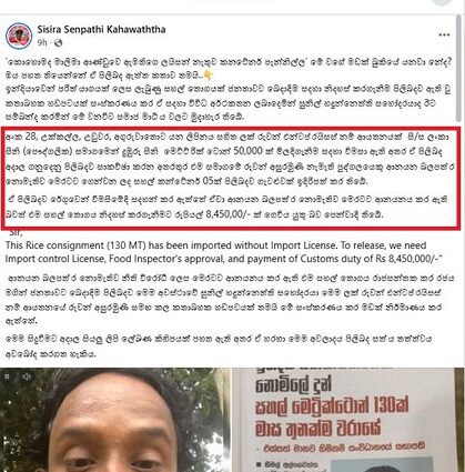 සුනිල් හඳුන්නෙත්ති මහතා දුන් කෝල් එකක් ගැන ආන්දෝලනයක් තියෙනවානෙ. රුවන් අසුරමුනි කියල මානව හිමිකම් සංවිධානයක සභාපති කෙනෙකු ඉන්දියාවෙන් ආනයනය කරපු කන්ටේනර් පහක කිලෝ 130,000ක හාල් වගයක් කිලෝවකට රු. 65 බැගින් වූ තීරු බදු නොගෙවා නිදහස් කරගැනීමට හඳුන්නෙත්ති ඇමතිතුමා මැදිහත් වූ බව තමයි කියන්නෙ. අපි නෙමෙයි කියන්නෙ ජනාධිපති මාධ්‍ය අධ්‍යක්ෂ හෝ එවැනි තනතුරක් තියෙන සිසිර සේනාපති කහවත්ත තමයි එයාගෙ ෆේස්බුක් ගිනුමෙ එහෙම කියන්නෙ. ඔහු කියන්නෙ මෙහෙමයි: “ඔය පහත තියෙන්නේ ඒ පිලිබද ඇත්ත කතාව තමයි..👇